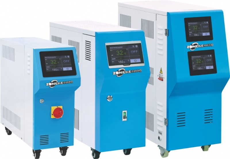 Water type mold temperature controllers has standard type, high temperature type, double power heating mold temperature controller, mainly control the mold temperature to be kept in a constant temperature state. It uses water as heating media to realize heat exchange by direct cooling for standard temperature control from 120 - 180°C. Water type has its superiorities with high efficient heat transmission, less pollution, water resource easy to be attained with low cost. It adopts dual P.I.D controller to make sure stable temperature which can be controlled precisely with accuracy up to ±0.2°C.