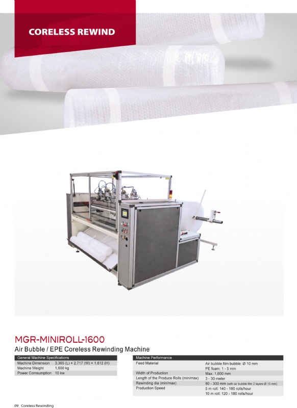 (1) Finished product This is a completely automatic rewinding machine (roll to roll) that allows to rewind air bubble film & PE Foam for packaging in small rolls without internal core. (2) Feeding materials a. Air bubble film bubble : ψ10mm b. PE Foam : 1 to 5 mm (3) Max diameter of the mother roll : 1,500 mm (max 30 kg roll) (4) Width of production : 300 - 1600 mm (5) Length of the produce rolls (min/max) : 3 - 30 meter with bubble Dia. 10 × Height 4 mm air bubble (6) Rewinding dia. (min/max) : 80 - 300 mm (with air bubble film 2 layersψ10mm) (7) Production speed: a. 5 m roll : Around 180 cycle/hour b. 10 m roll : Around 140 cycle/hour