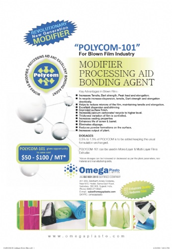 POLYCOM-CL: It is non-migrating processing aid & modifier for clear and opaque application. It can be used as 0.5% to 1% as processing aid, 0.5% to 25% as modifier. Which increases strength, tensile strength, dart, elongation, and clarity.