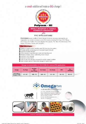 POLYCOM-HI: It is impact modifier and tensile enhancer for PVC applications. It is used where customers want to use higher calcium like PVC PIPES, PVC SHEETS, PVC ROOFINGS, PVC PANEL, etc. POLYCOM-HI dosage in final application is 0.5 phr to 1.5 phr.