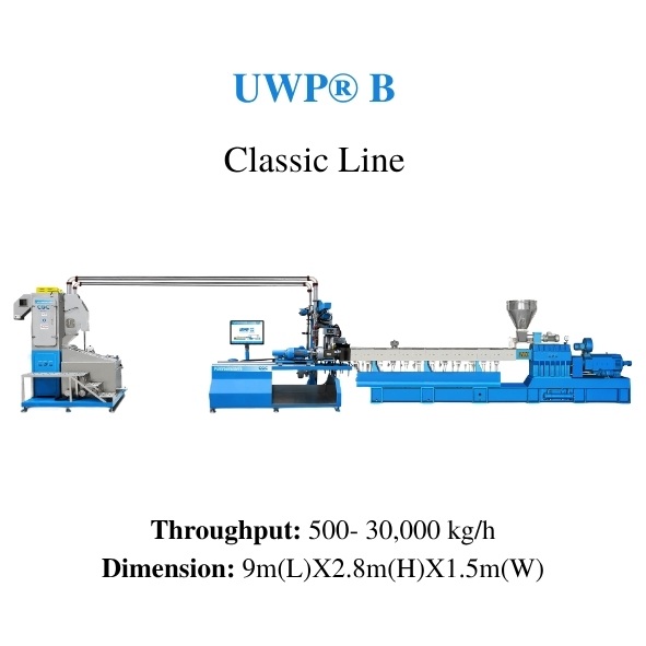UWP B: pelletizer, water system together with drier and control cabinet are in individual module, which can be placed in separately The benefits of our underwater pelletizing system: * Suitable for various polymer’s pelletizing, throughputs are from 20-30,000 kg/h; * High quality and uniform pellets in variable sizes, even micro-pellets of 0.5mm; * Energy-efficient centrifugal drying system, with final pellets contain less than 2000PPM moisture; * Suitable to process almost all viscosities; * Save operating costs through high level of automation and easy maintenance; * High-efficiency closed loop water system, optimization of process water consumption, greater economic and environmental sustainability; * Compact design, little space is required; * Automated easy-to-use control system with constant product quality, independent on operators’ experience