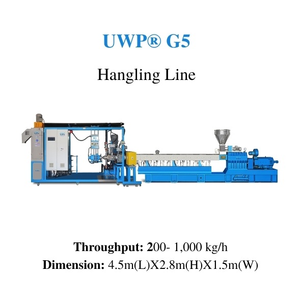 UWPR G5: is also compact design like G12, entire system with start-up valve and water system including drier is mounted on a mobile frame, pelletizer is suspension from the ceiling, adjustable in longitudinal and axial directions. * Suitable for various polymer’s pelletizing, throughputs are from 200-1,000 kg/h; * High quality and uniform pellets in variable sizes, even micro-pellets of 0.5mm; * Energy-efficient centrifugal drying system, with final pellets contain less than 2000PPM moisture; * Suitable to process almost all viscosities; * Save operating costs through high level of automation and easy maintenance; * High-efficiency closed loop water system, optimization of process water consumption, greater economic and environmental sustainability; * Compact design, little space is required; * Automated easy-to-use control system with constant product quality, independent on operators’ experience